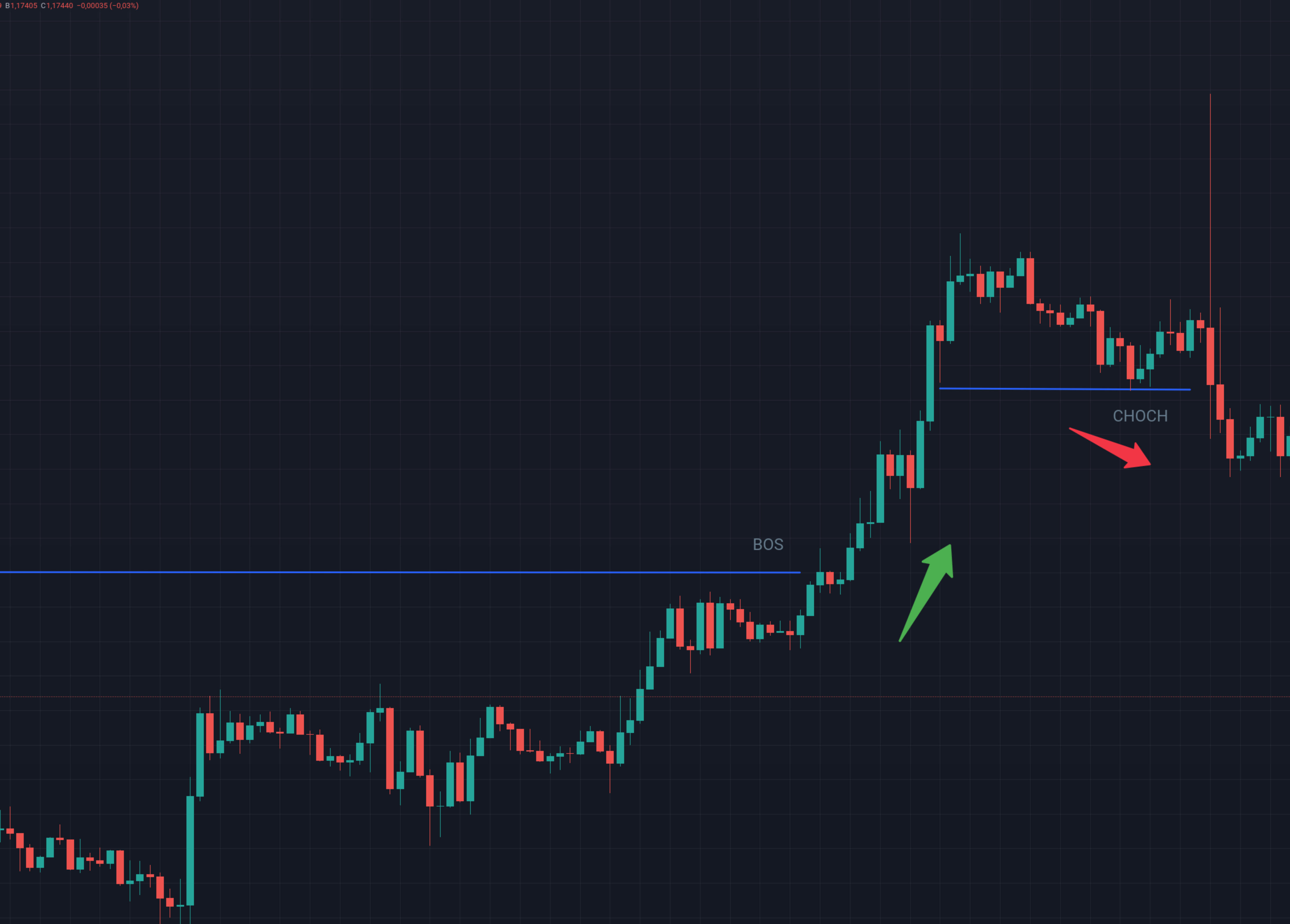 Example: in an uptrend, a new Higher High breaking the previous High = BOS. - Change of Character (CHOCH): signals a possible reversal.